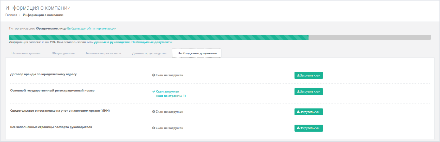 После того, как вы перейдете в раздел "Информация о компании", необходимо заполнить вкладки «Налоговые данные», «Общие данные», «Банковские реквизиты» и «Данные о руководстве».